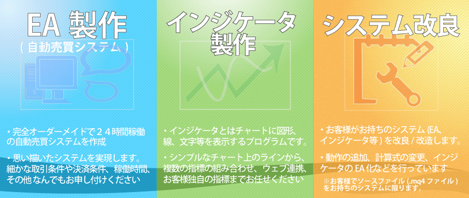 メタトレーダー4用の各種プログラムをオーダーメイドで作成しています。お見積り無料、即日納品可能、Skypeによる打合せ対応。